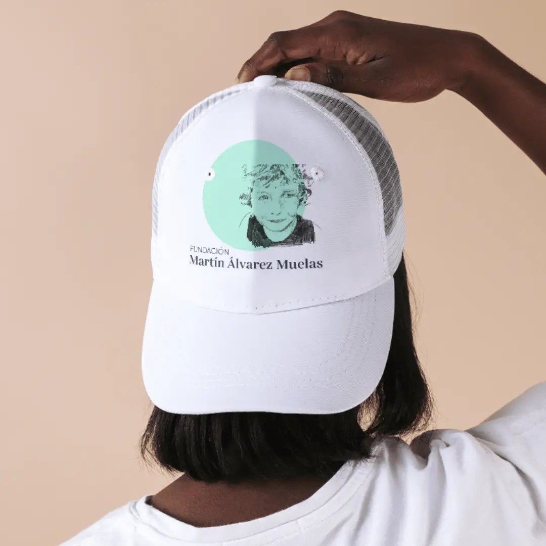 Gorra de color blanco puro con un diseño contemporáneo y minimalista que incluye el logo con el emblema de la “Fundación Martín Álvarez Muelas” en la parte frontal, destacando así el compromiso con la causa.